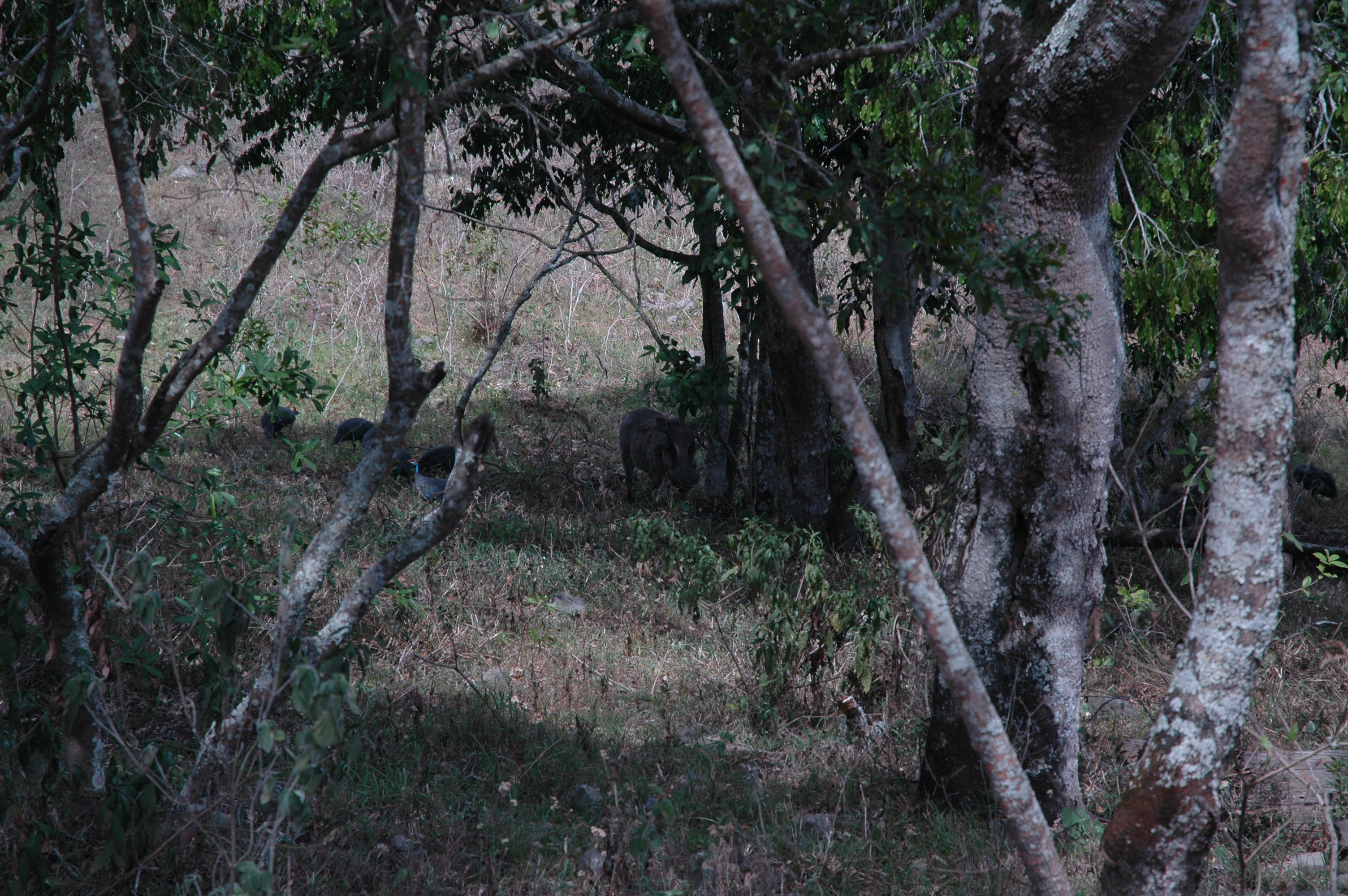 Girafe avec phacochère au milieu en bas qui vient vers nous